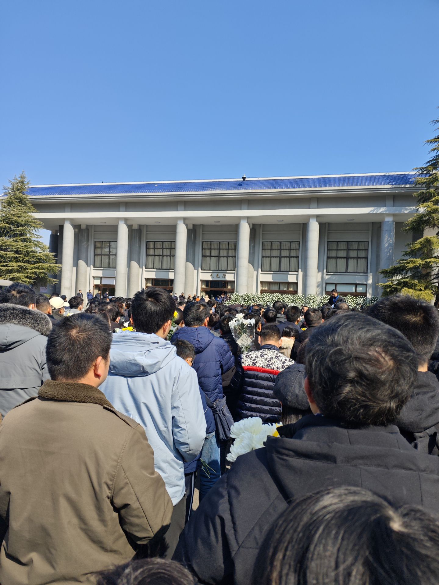 终于,殡仪馆大门打开,人们得以排队进入灵堂前的广场,按行分批进入灵堂悼念。排队过程中有三位让我印象比较深刻的人士,他们排在我后面彼此交谈。我从听到的只言片语中得知其中的一位男同学是上海交大的学子,算得黄老先生的校友,昨夜乘高铁赶来武汉;一位较年长的女士在武汉光谷当音乐老师;还有一位女同学是在本地上学的大学生,都是专程过来送行的。