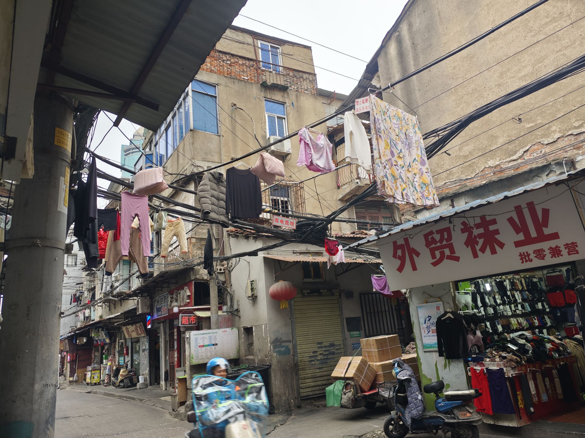 或许是气候原因使武汉室内不宜晾晒,我看到许多人家都会选择把衣物挂到室外去。规矩些的,从自家窗台伸出几根铁棍、竹竿充作晾衣架;不客气些的呢,老街上方随处可见纵横交错的电线,直接就把衣物挂在上面,视旁边各种“有电危险”“禁止晾晒”的警示牌如无物,使人啼笑皆非。