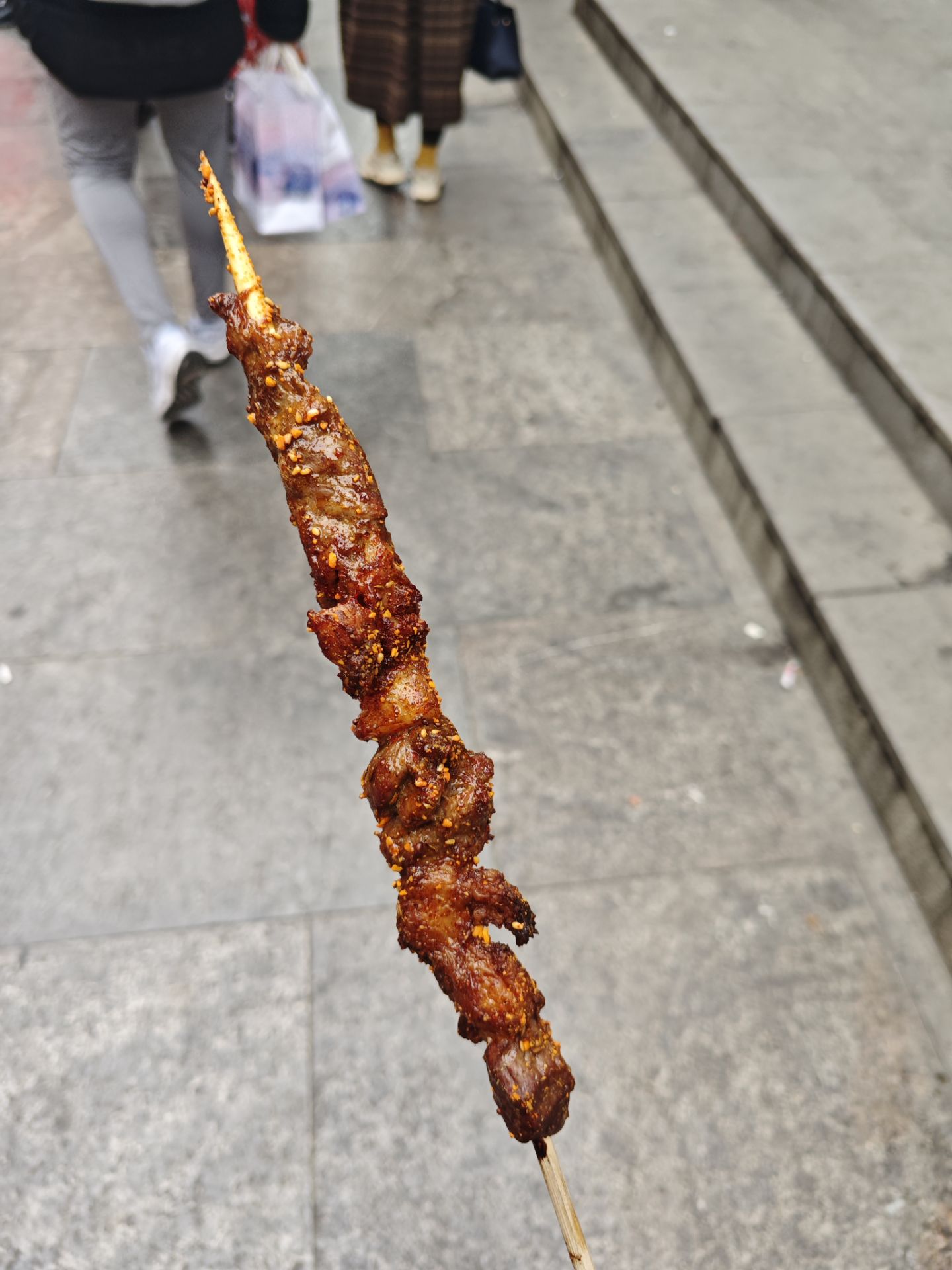 我在旅途中胃口会比较小,但今天一整天只喝了瓶汽水,再小的胃口也该觉得饿了。正巧在路边看到一家什么正宗内蒙古烤羊肉串,围观者甚多,油滋滋的羊肉串就摆在透明的烤炉里旋转,让人望之忍不住咽口水,遂买一串尝鲜。怎么说呢,味道略嫌寡淡,吃几块解馋尚可,吃整串则觉腻。于是我又买了一大块哈密瓜。