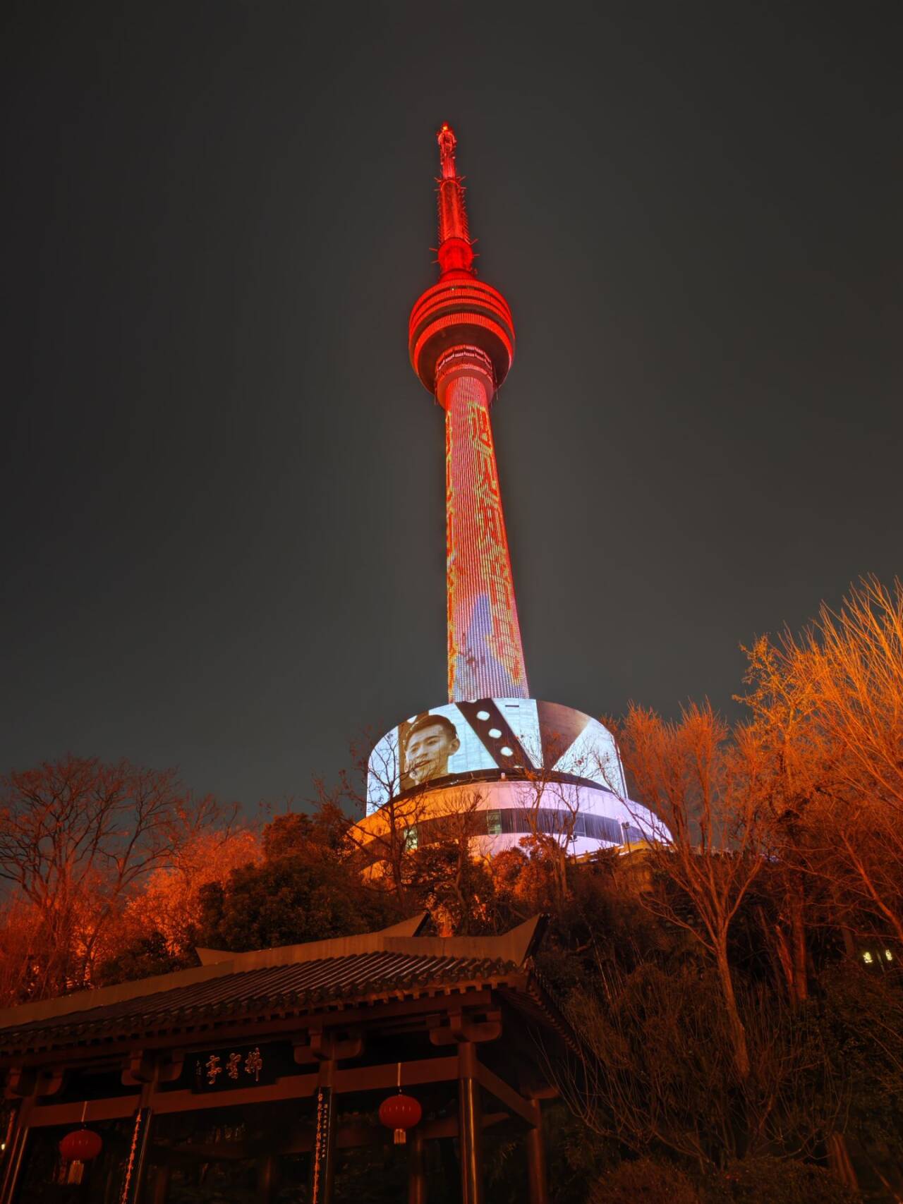 晴川阁、黄鹤楼声名在外,黄鹤楼位于蛇山上,据说就有人以为龟山上的这座建筑就是晴川阁,实际上它九十年代才建成,为龟山上三国文化城的一部分。龟山风景区里还有周瑜之后的东吴大都督鲁肃之墓、裸衣骂曹的祢衡之墓,只不过这一段都是我后来了解到的内容,当时只是登顶后休息片刻,眺望黄鹤楼、长江大桥,就又慢悠悠地下山去了,并未得见古迹。倒是路旁的一树樱花在灯光的映照下如梦似幻,让我忍不住一再驻足。