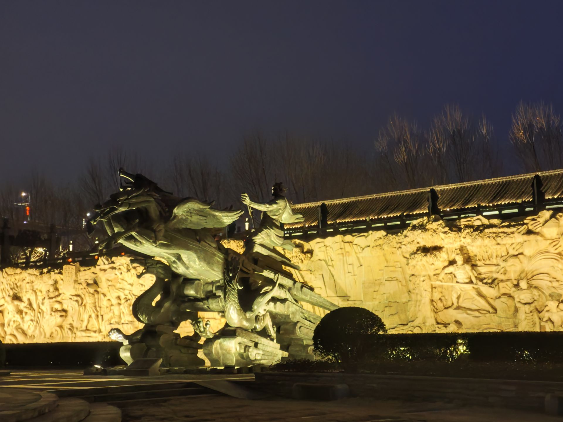 下了山,沿路寻找江滩入口,忽然发现一处拐向江岸的楼梯。步入其中,一座座神话雕塑出现在眼前,其中又以一尊昂藏大汉与其身后的大片浮雕为最。天色昏暗,我没有看到雕像的标题,但一个名字油然从心底浮现:大禹!后来果然得知,此处名为大禹神话园。