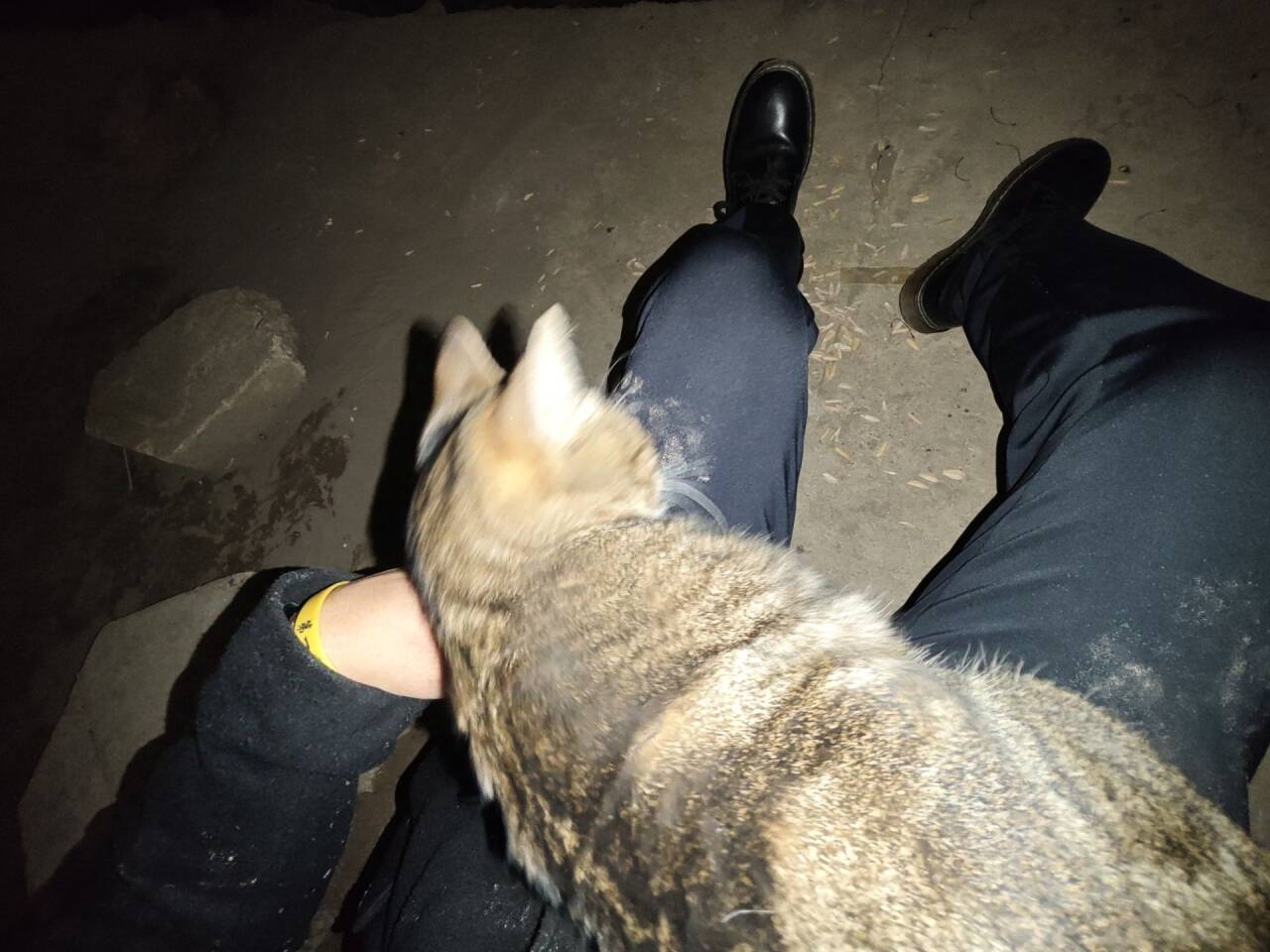 我环顾四周,不见旁人,也不知此猫名姓,姑且以猫猫兄称之。猫猫兄平易近人,而且温柔体贴。我摸它的脑袋,它就摇头蹭我的掌心;我把手伸到它面前,它就伸出舌头舔我的手指。我说:“喵?”猫猫兄对曰:“喵~”句句有回应。